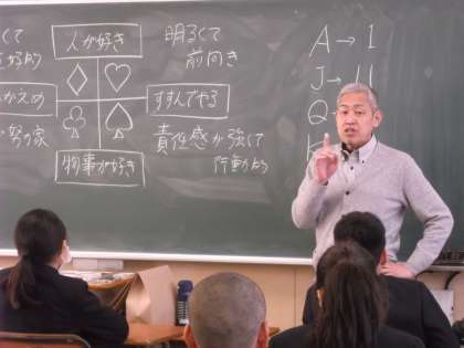 3月12日(月)、ヒューマンキャンパスより川島先生にお越しいただき、1年生でSPトランプを行いました。SPトランプとは、サブ・パーソナリティをトランプにしたものです。52枚のカードには人格を構成する部分や面が描かれています。その中から自分に合っているものを10枚選びその組み合わせにより、自分の性格やどんな職業が向いているのかなどを判断します。川島先生からはユーモアを交え、リズミカルでわかりやすい授業でそれぞれ分析をしていただきました。子どもたちも積極的に発言し、とても有意義な時間になりました。川島先生、どうもありがとうございました。