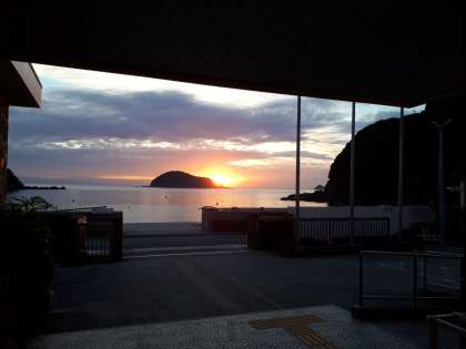 5/22(火)日高少年自然の家から見えた「夕日」です。水平線に沈む夕日には趣があります。