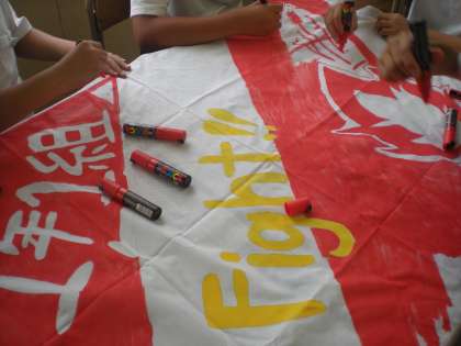 体育大会に向けて、各学年各学級が学級旗の作成に取り組んでいます。各クラスで選んだデザインをもとに有志が力を合わせ、色をつけていきます。各クラスとも工夫を凝らしたものになると思います。