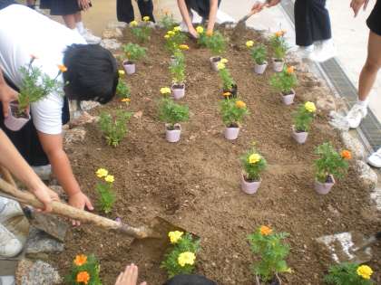 本校の緑化活動として、花の植え替えを美化委員で行いました。パンジーを植えていた正門を入ってグラウンド側の花壇から植え替える形で、マリーゴールドを植えました。美化委員が協力してくれたおかげで、短時間で作業を終えることができました。