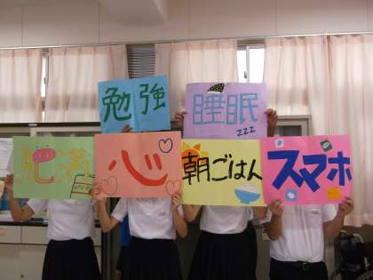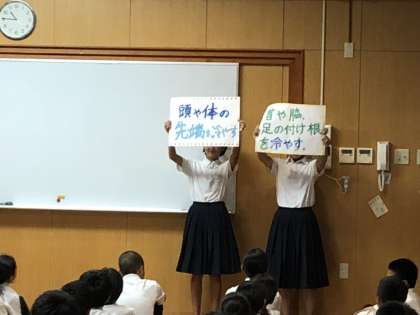 1年生では、「あ」「つ」「さ」「に」「ま」「け」「な」「い」の頭文字から始まる標語を作成し、2年生は、熱中症の対策について劇を交えて説明しました。3年生は受験に向けて、睡眠と健康について説明しました。