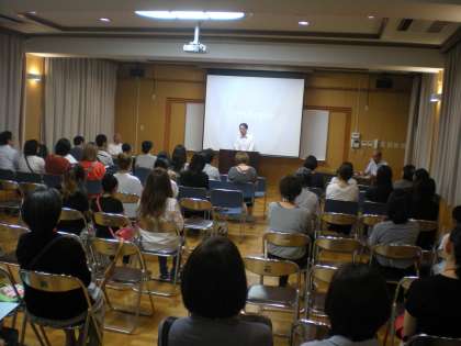 多目的室において学校説明会も行いました。学校説明会では、まず、学校紹介のDVDをご覧いただき、学校長より