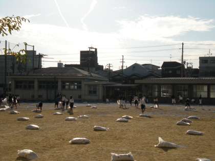 グラウンドににがりを撒きました。にがりを撒く理由としては、その特性によってグラウンドの表面の安定と湿度を保つことで、砂埃が立ちにくくなる効果を狙ってのものです。そのため定期的に撒くことでグラウンドのコンディションを整えます。各運動部が率先して行なってくれたため、短時間で撒き終えることができました。