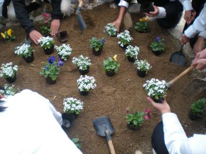 マリーゴールドを植えていた正門を入ってグラウンド側にある花壇にパンジーなどを植えました。美化委員が協力して行ってくれたおかげで、短時間で作業を終えることができました。