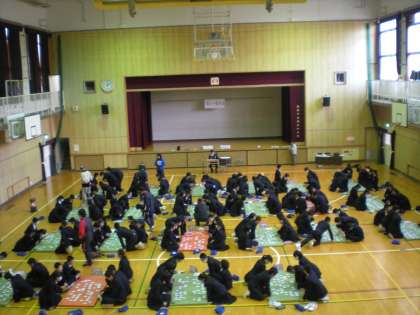琴のBGMが流れる中、読み札は学年の先生が分担して読んでいき、1札1札読まれるたびに、全員が集中し、「はい」という元気な声で札をとっていました。