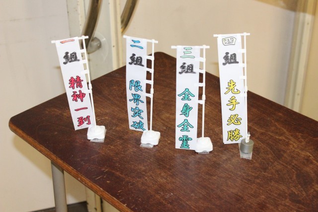 写真は開会前の様子と、特別支援学級の生徒が作った各クラスののぼり(ミニチュア版)です。