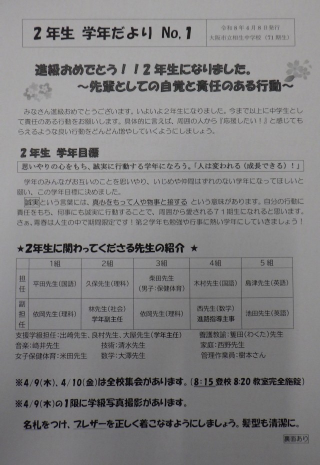 2年生 学年だより No.1 (71期生、令和8年4月8日発行)