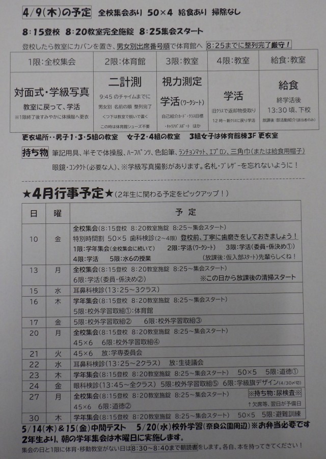 ※4/9(木)、4/10(金)は全校集会があります。(8:15登校8:20教室完全施錠)
