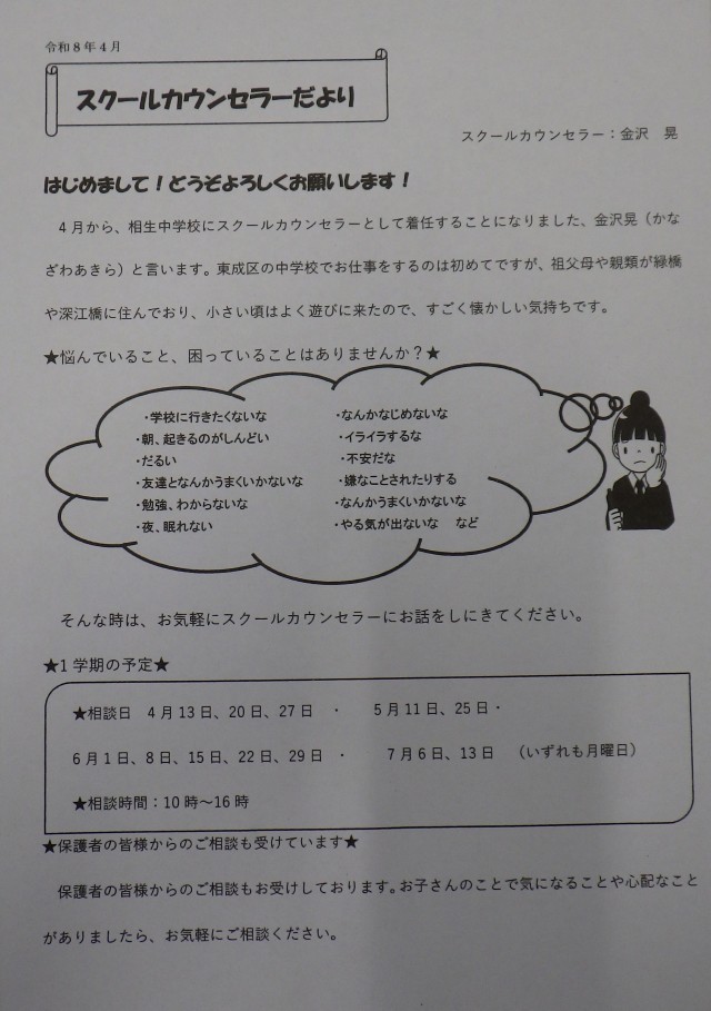 4月から、相生中学校にスクールカウンセラーとして着任することになりました、金沢 晃(かなざわ あきら)と言います。東成区の中学校でお仕事をするのは初めてですが、祖父母や親類が緑橋や深江橋に住んでおり、小さい頃はよく遊びに来たので、すごく懐かしい気持ちです。