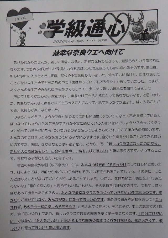 今回のなら校外学習(以下奈良クエ)は、みんなの輪を広げるきっかけにしてほしいと思います。班によっては、以前から仲がいい子や話せる人がいる班もあることでしょう。その逆に、ほとんど話したことがない人ばかりの班もあることでしょう。中には、気持ち的に「嫌だな」「行きたくないな」「面白くないな」と思う人もいるかもしれません。その気持ちは理解できます。でもやっぱり縁があって出会ったこの36人。みんなで最幸なクラスを作っていきたいと僕は思うのです。誰かが幸せではなく、みんなが幸せになってほしいのです。班の取り組みや活動を通して「どうすれば、あの子も一緒に楽しめるだろう?」と考えてみてください。それこそが、本当の意味での「協力」や「思いやり」であり、新しいクラスで最幸の関係を築く第一歩となります。「自分だけがいい」ではなく、「みんながいい」と思えるような関係や環境づくりをめざせる、器が大きくて、優しい人に育ってほしいと僕は思います。