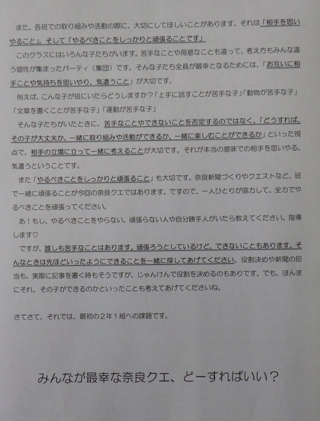 また「やるべきことをしっかり頑張ること」も大切です。奈良新聞づくりやクエストなど、班で一緒に頑張ることが今回の奈良クエではあります。ですので、一人ひとりが協力して、全力でやるべきことを頑張ってください。