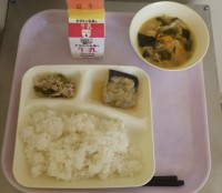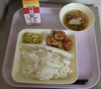 4月20日(月)本日の献立鶏肉の竜田揚げ五目汁キャベツの梅風味ごはん牛乳