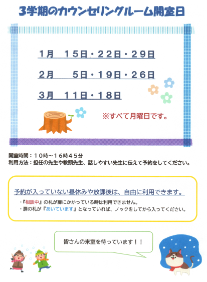 本校では月曜日、スクールカウンセリングルームを開室しています。 スクールカウ...