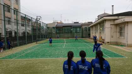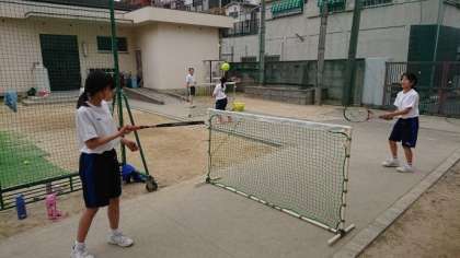 テニス部の一年生はボールになれるため、近い距離でボールを打ち合う練習をしていました。二、三年生はさすがです。コートの端から端までサーブが美しく決まっていました。小雨でしたが、一生懸命練習していましたよ。