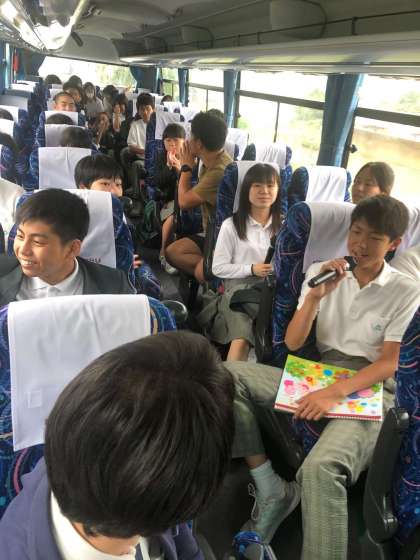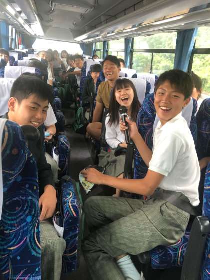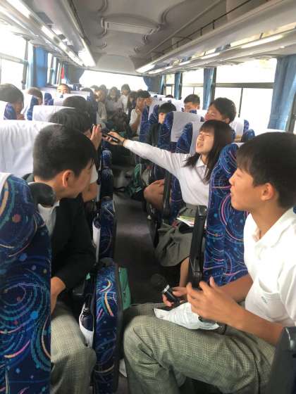 いざ四国高知へ、3時間のバス旅です。修学旅行実行委員会のバスレク係が車中を盛り上げます。