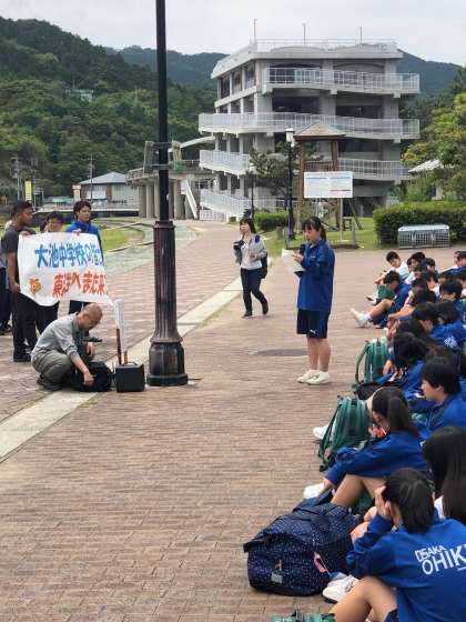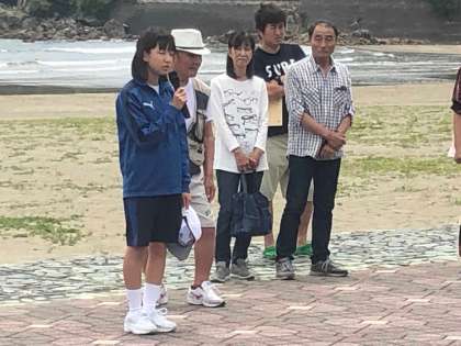 各家庭に送ってもらい、白浜海岸にて、生徒の司会で退村式です。