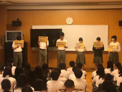 先週の各学年集会は、それぞれ各学年の保健美化委員から、熱中症予防講座と題して、この時期の健康管理についてアピールがありました。