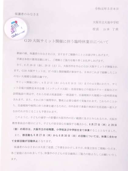 G20大阪サミットが大阪市内で行われる関係から、生徒の安全確保の主旨で大阪市内の公立学校園は、昨日からサミット終了の30日まで休業措置となっています。