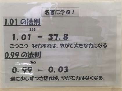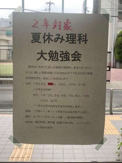 めざせ学力向上! 公開日 2019/08/05 更新日 2019/08/05 お知らせ 本校ではこの間、教職員努力目標に学力向上を掲げ、校長経営戦略予算を活用し、英語検定の全校生徒受験や学習室の整備など、校内学習環境にも務めてきました。 先生方も、努力目標をしっかりと理解し、学力向上策を実行してくれています。 夏季休業中たりとも、決して手を抜きません。 いいね(0)