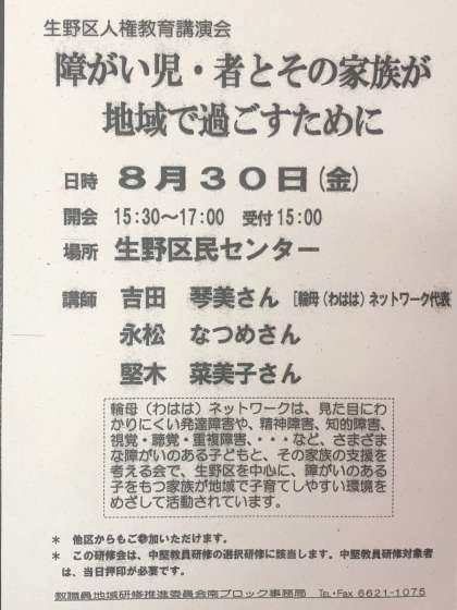 8月の研修週間の最後を飾るのは、30日にリゲッタいくのホールで行われた生野区人権教育講演会への全職員参加です。