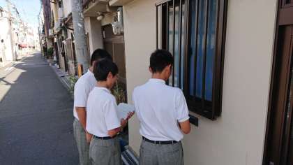 生徒たちは、少し緊張した面持ちでインターホンを押し、お家の方々と話していました。ご不在のお宅には封筒入りの書類を投函させていただきました。
