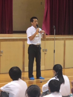 それにちなんで、最終日となる今日の全校集会は、区役所の方を招き、「自転車で歩道を通行する時に気をつけること」をテーマにお話しして頂きました。