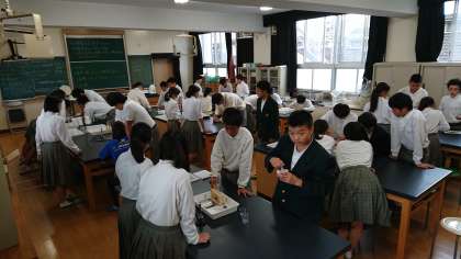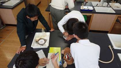 2年生実験 公開日 2019/10/28 更新日 2019/10/28 できごと 21日、2年生の実験が理科室でありました。硫黄と鉄を混ぜて加熱すると熱と光を放ち、化学変化が起きます。 さらに、塩酸を食わせると卵の腐ったような臭い(腐卵臭)が出てきます。生徒たちはにおいにとても驚いていました。においの印象が強すぎて実験の内容を覚えているか心配です。 いいね(0)