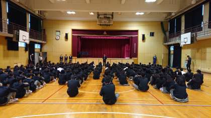 今週月曜日ははあいにくの雨のため、体育館で全校集会が行われました。
