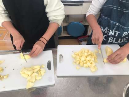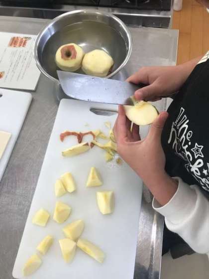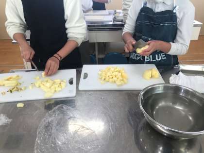 1年生調理実習 其の一 公開日 2019/12/13 更新日 2019/12/13 できごと さて、1年生リンゴ皮むきテストの次は、むいたリンゴを使って、調理実習を行いました。 今日のメニューはアップルパイ。初めて包丁を扱う生徒もいましたが、家庭科の永井先生ご指導のもとリンゴの皮を剥き、リンゴを一口サイズに切っていきます。 いいね(0)