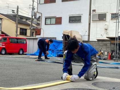 消防署はホースの巻き取りや消化訓練を。
