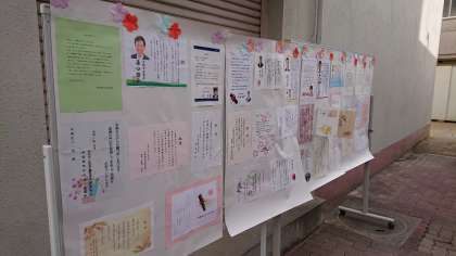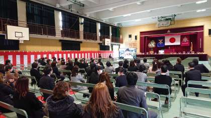 あいにくの状況のため、来賓の方々はご参列いただけなかったのですが、体育館の入り口にはたくさんの方々からの祝電を掲示させていただきました。