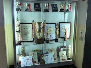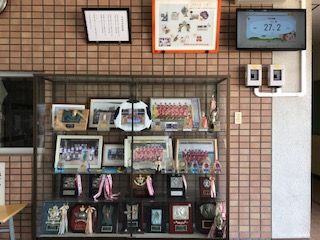 大池中学校には、たくさんの部活動が活発に活動しています。中学校の玄関を入ると左右に先輩方が部活動で活躍して持ち帰った盾やトロフィー、症状が飾ってあります。