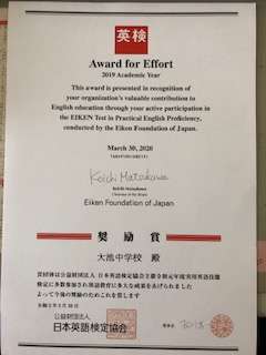 月曜日の全校集会で校長先生より披露されましたが、前年度に英検(実用英語技能検定)の全校受験など、英語教育を積極的に行ったことに対し、奨励賞をいただくことができました。