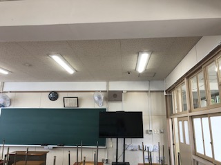 2学期が始まる前のこの夏休み中に2年生の教室の整備を行いました。1組にプロジェクター、2組に液晶モニター、そして2年学習室を含む2年全3教室の照明をLED照明に取り替え、学習環境を整備しました。