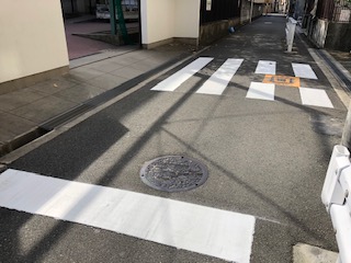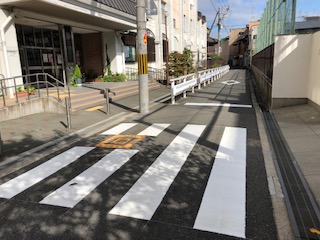 また、先週の連休中に、学校の東校舎と本校舎の間を通る道路に示されている横断歩道や一時停止線などをきれいに塗り直していただきました。