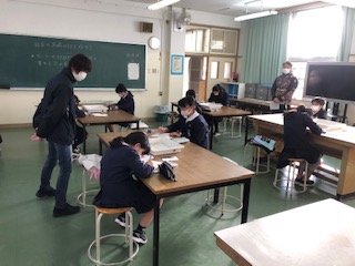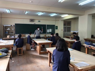 中学校に到着後、生徒会執行部の司会でオープニングプログラムを行い、まずは各教室に分かれて授業を体験しました。技術と美術の授業の様子です。