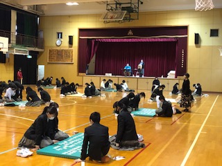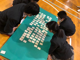 給食を食べ、昼休みの間に自分たちで協力して武道場の畳を体育館まで運び入れて準備して行いました。雅やかなBGMが流れる中、先生方が交替しながら読み札を読み始めると同時に取り札を探す人、取り札に書いている下の句が読み始められてから取り札を探す人、一人ひとりが冬休み前から取り組んでいた成果は出たでしょうか?