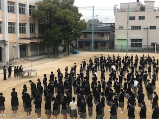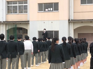 3学年が揃う最後の全校集会。月曜日は雨が降っていたので、火曜日に変更して行いました。