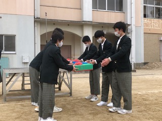 校長先生のお話の前に、「3年生を送る会」を行いました。今年の送る会は運動場で行い、1年生の男子学級委員長が在校生を代表して3年生の男子学級委員長に、卒業式当日に胸のポケットに差すリボン付きのボールペンを送りました。3年生からは感謝の言葉と、1,2年生に大池中学校を託す力強いメッセージが送られました。
