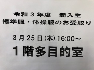 3月25日(木)16時より、本校1階多目的室にて新入生のご注文されました標準服・体操服の受渡しがあります。すでに案内があったと思いますが、ご確認ください。よろしくお願いします。