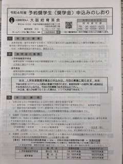 9月初めに3年生の生徒全員に大阪府育英会の「令和4年度予約奨学生(奨学金)申込みのしおり」を配付しています。高等学校等へ進学を希望する生徒で、向学心に富みながら経済的理由により修学が困難な方に対し、進学前に奨学金貸与を予約する制度です。