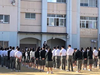 全校集会の前に生徒集会が行われ、各生徒専門委員会と生徒会からの月間目標が発表されました。