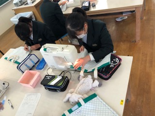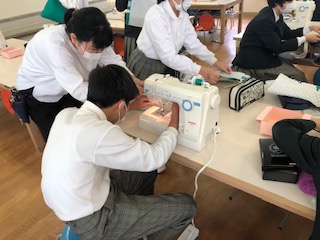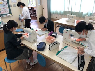 家庭科の授業でタブレットを入れるカバンを作っています。今日は2年2組が被服室にてミシンを使って裁縫をしていました。先生や友人に教えてもらいながらも、丁寧に作っていました。