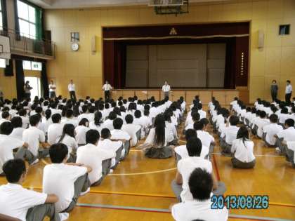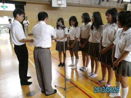8月26日(月)に体育館で2学期始業式を行いました。1年生、2年生の教室にもエアコンが設置され、全学年とも授業に集中するようにという話と、大きな行事である体育大会を成功させようと激励をしました。その後、夏休み中の部活動の成績について表彰を行いました。