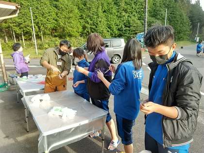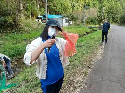 魚つかみのグループです。川で魚をつかんで、内臓をとって串刺しすます。魚はあまごです!
