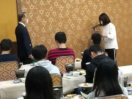 入所式を夕食時に行いました。お世話になるホテルに代表の生徒があいさつしました。大きくて素敵なホテルです。その後、豪華な夕食です。