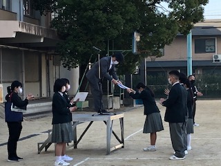 後期生徒会執行部と学級委員長に認証状を授与しました。生徒会の活動は表に出ない活動もたくさんありますが、学級の、学校のリーダーとして頑張ってください。