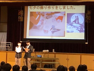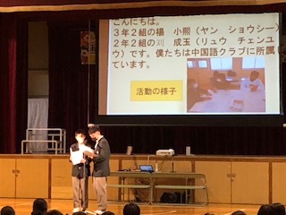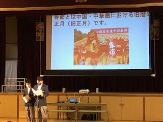 次は中国語クラブの発表です。 活動報告と中国の行事「春節」を紹介してくれました。