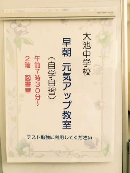 元気アップ学習会 公開日 2015/05/20 更新日 2015/05/20 お知らせ 中間試験1週間前の19日より、元気アップ地域本部事業で「早朝元気アップ教室」が本校の2階図書室で開かれています。覗いて見るとたくさんの3年生女子が真剣に勉強に取り組んでいました。20日の今日も覗きましたが、なぜか女子ばかり、「男子はどうなってんねん!!」と思わず叫んでしましました。明日に期待しています。とにもかくにも、大池中よく頑張っています。 がんばれ大池中男子! いいね(0)