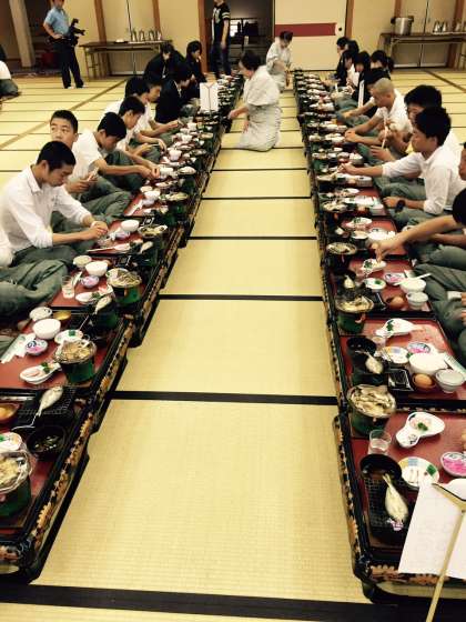 昨夜は、ラフティングで体が冷えたのと、激流でのライディング、そしてゴール付近での飛び込みとかなりハードなプログラムに疲れていたようで、就寝も早くから夢に引き込まれていったようです。翌朝の食事も朝からガッツリでした。